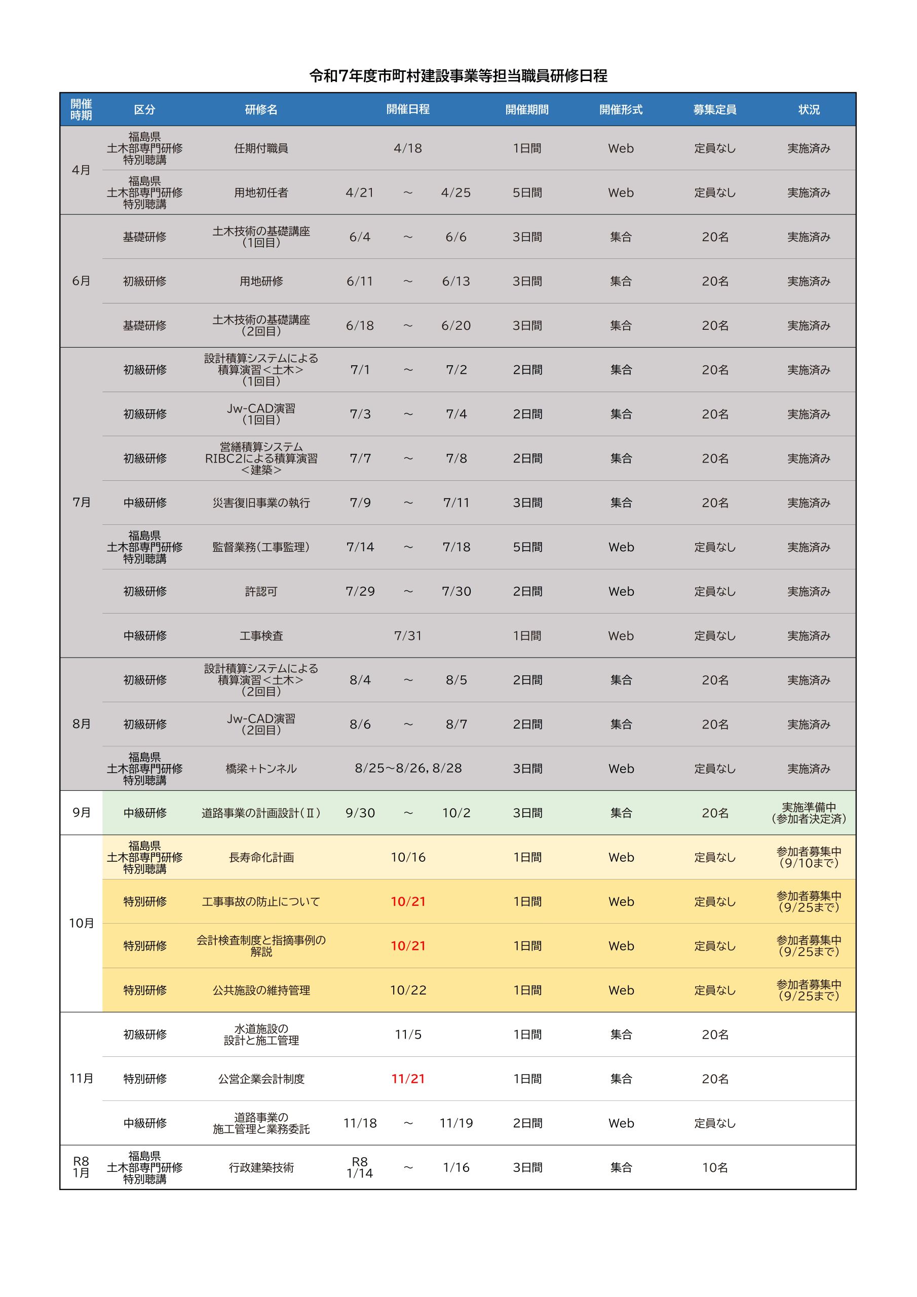 《令和7年10月実施分》【工事事故の防止について】【会計検査制度と指摘事例の解説】【公共施設の維持管理】を実施します(募集は終了しました) 2025年09月25日 研修事業 市町村建設事業等担当職員(短期)研修事業 特別研修 工事事故の防止について (令和7年10月21日) 会計検査制度と指摘事例の解説 (令和7年10月21日) 公共施設の維持管理 (令和7年10月22日) 上記研修の募集を開始しました。9月25日 (木)の15:00までにお申し込みください。 研修事業 前の記事お知らせ一覧次の記事